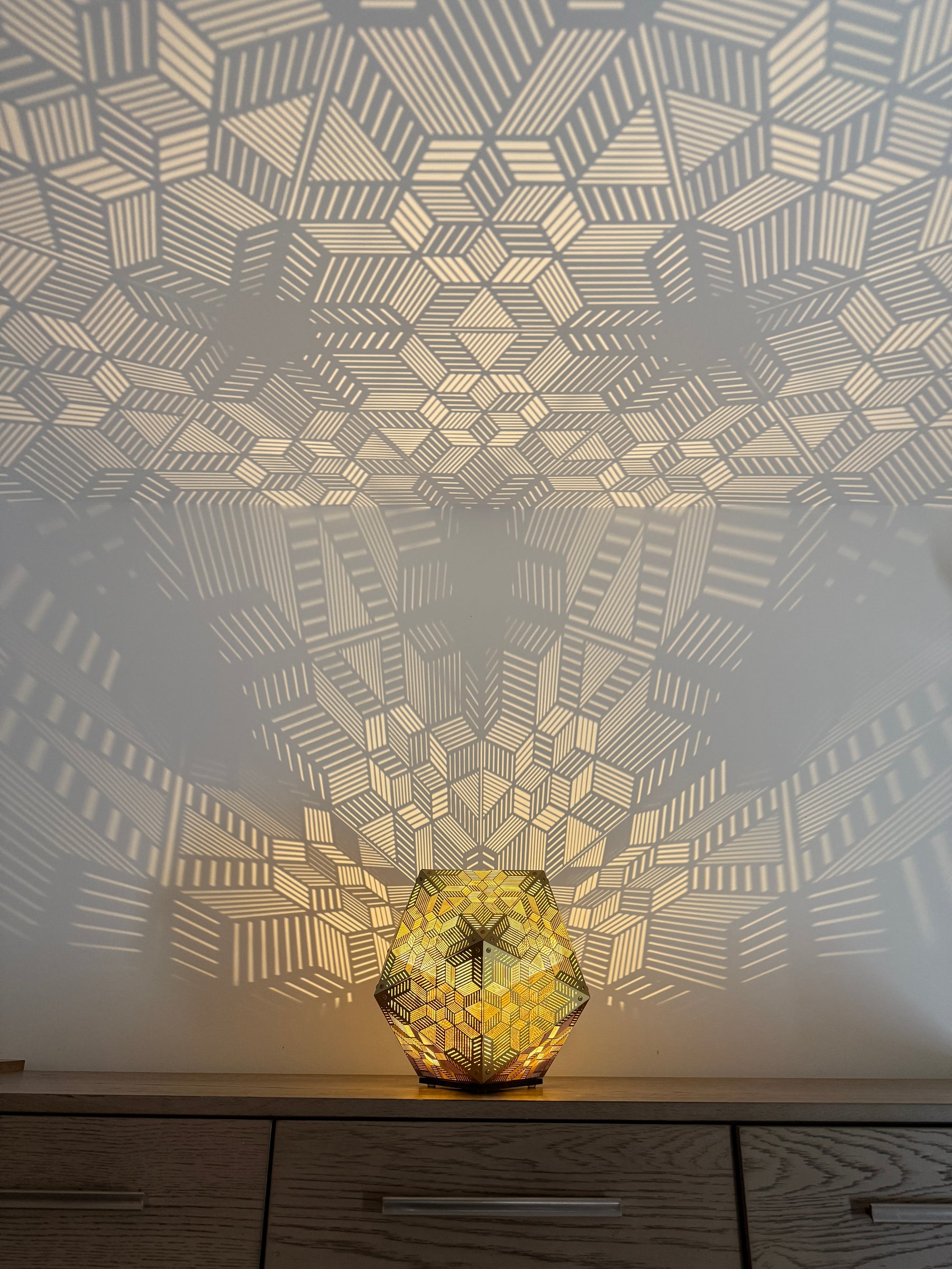 A limited edition geometric table light with patterns based on the illusionist drawings of MC Escher. Mathematical objects are contained within this mind bending blend of isometric design. Reflection, symmetry, perspective and tessellation will leave you inquiring into the vast possibilities of infinity.